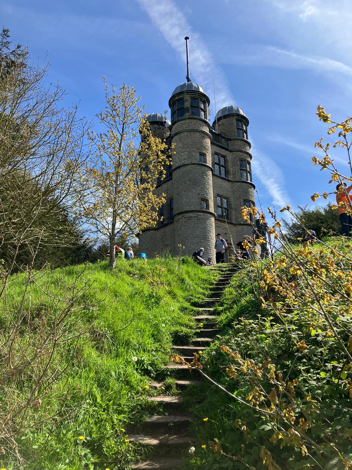 We had thirty one walkers on today’s walk which included two new members. The walk started from the car park in Baslow and went past thatched cottages into the grounds of Chatsworth House, taking the slightly higher path towards the house we encounted a herd deer off to our left. When our group got to the main car park we veered off round the back of the house and started the climb with trees all around us up to the Hunters Tower were we stopped for a coffee break and a chance to take in the view and some photos.