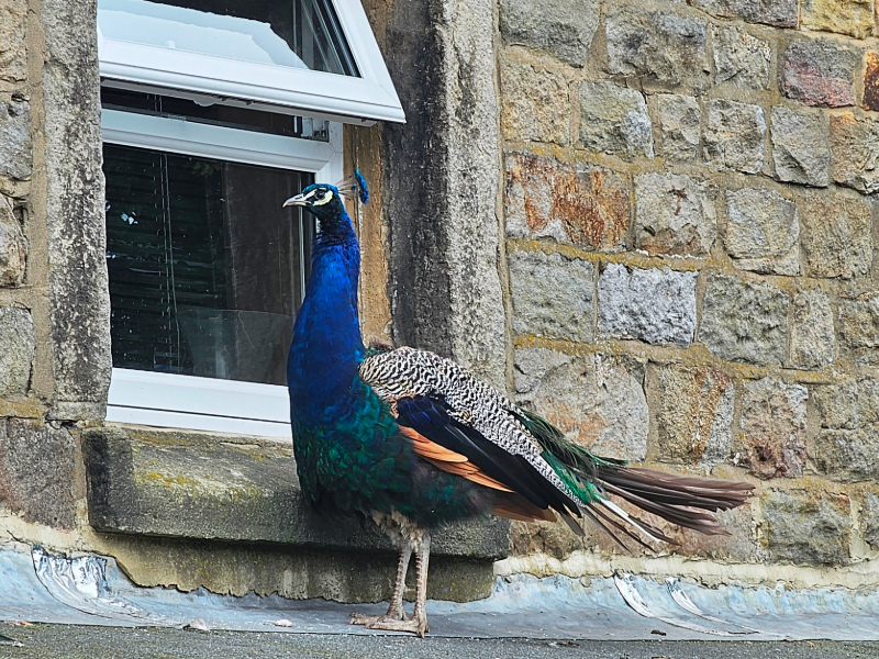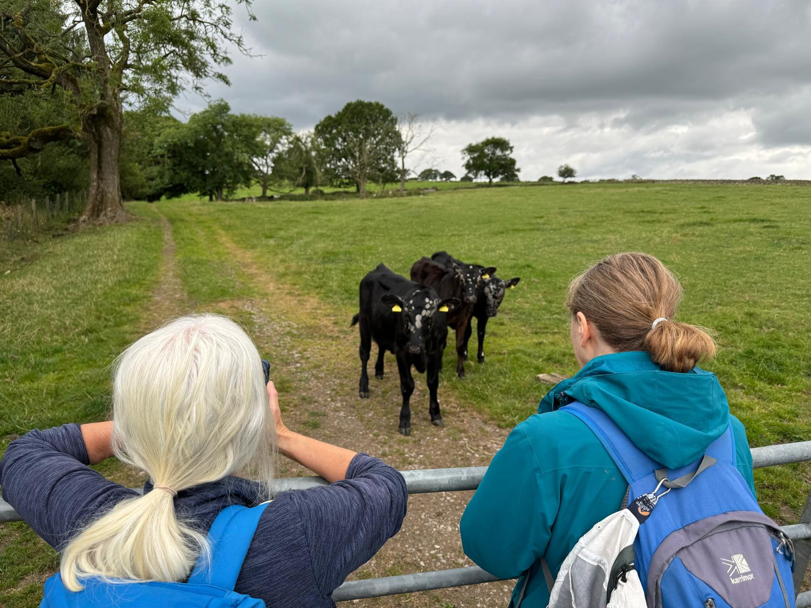 The non-walkers were dropped off at the bus stop next to Betty’s Tea Rooms. The bus carried on the A59 towards Blubberhouses, dropping off the walkers at the Sun Inn pub. After all the sun the week before, we set off under a clouded sky after a photo call with the resident peacocks at the pub and a Red Kite circling above. The walkers went through meadows, woodland, and farmland to our coffee stop above John O’Gaunt’s Reservoir, only to find a small group of walkers had beaten us. We carried on to Long Liberty Farm, where some of the group were chased by a herd of cows, just managing to close the gate before we had any casualties.
